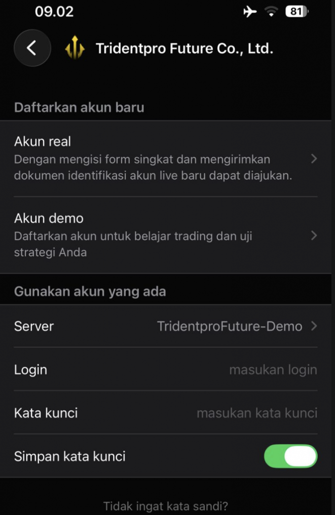 Langkah selanjutnya ketikkan nama broker. Cukup ketikkan trident atau tridentpro.