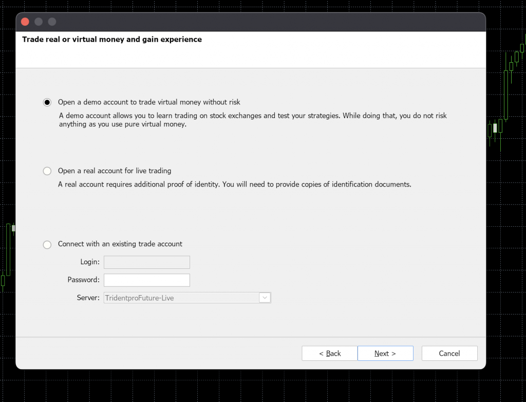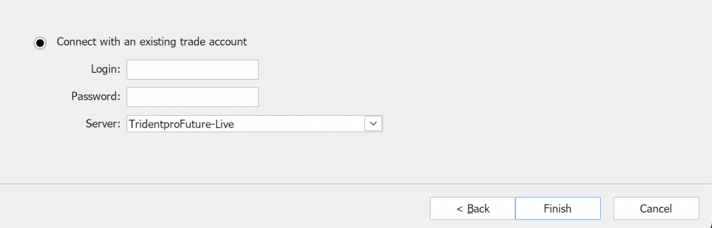 Untuk masuk ke akun real pilih Connect with an existing trade account lalu masukkan login dan password yang sudah dikirimkan email. Untuk server pilih TridentproFuture-Live. Lalu Klik Finish.
