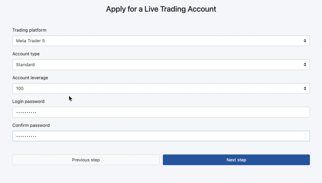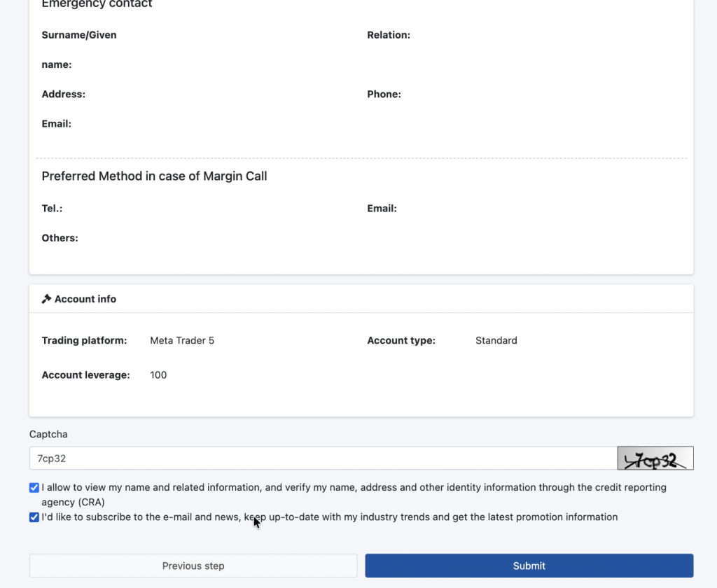 • Plarform, Account Type, Leverage saat hanya ada satu pilihan jadi isikan sesuai pilihan yang disediakan)