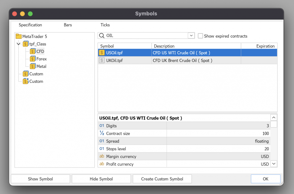 Untuk menambahkan instrument OIL di MetaTrader 5 Desktop silahkan masuk ke View lalu Symbols. Ketikkan OIL atau USOil lalu pilih Show Symbol.